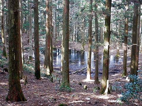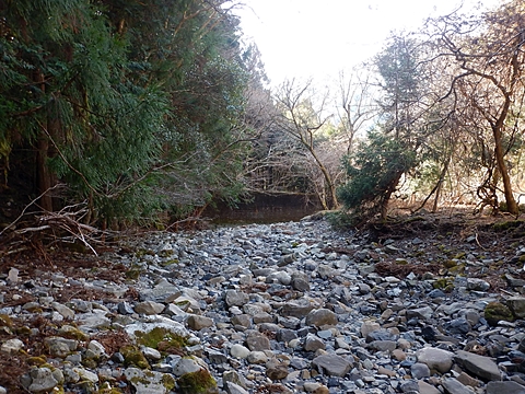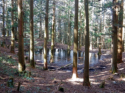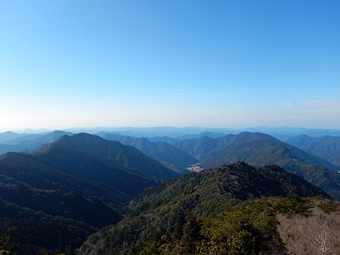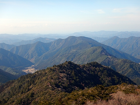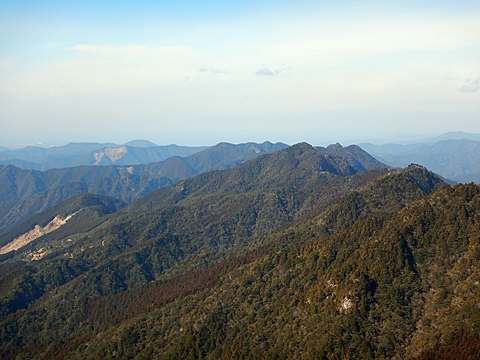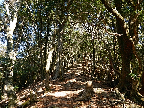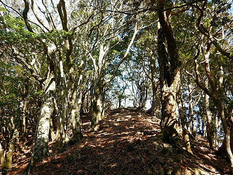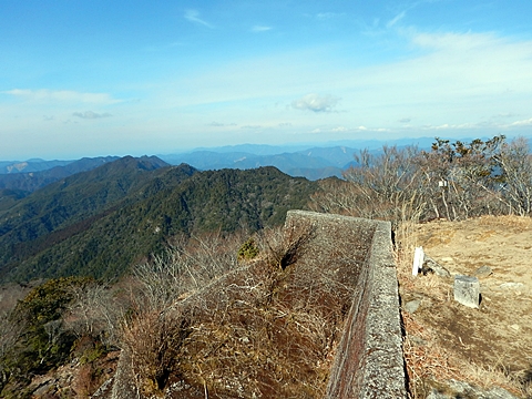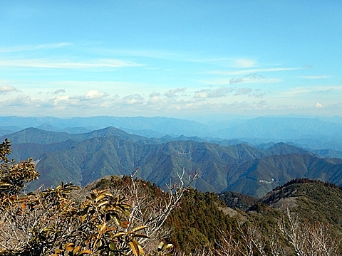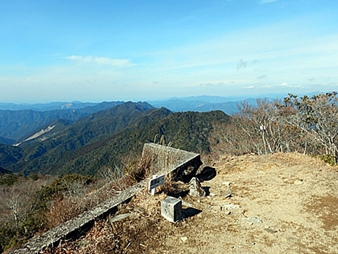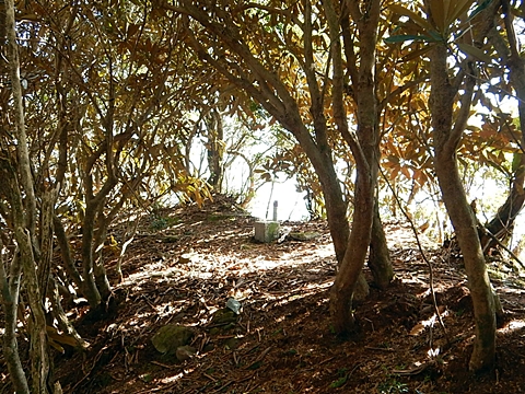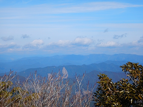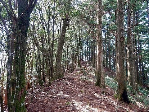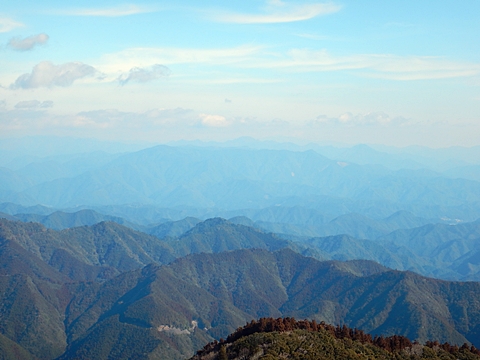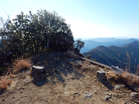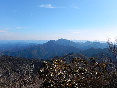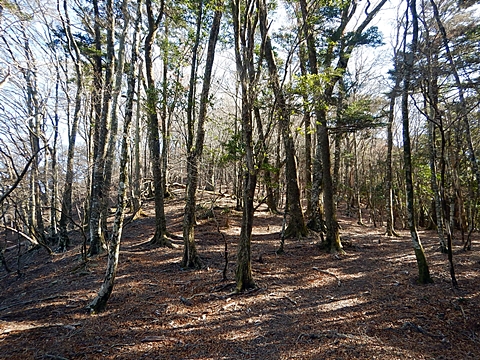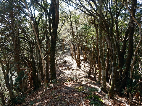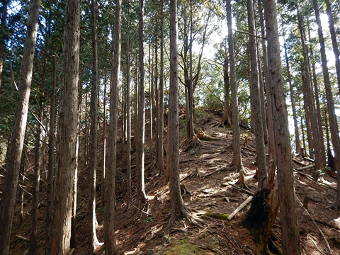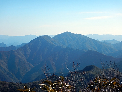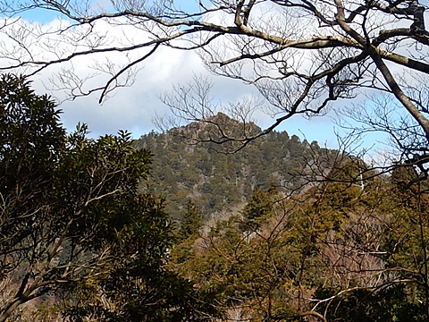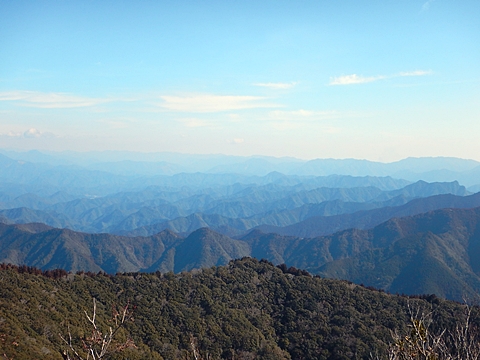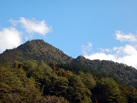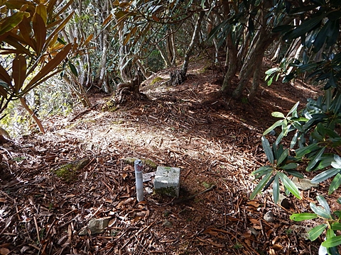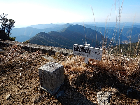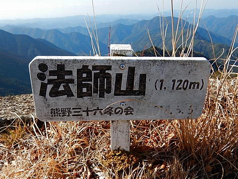 ■大塔山系で国土地理院の地形図に記載のある標高1000mを超える山は、大塔山と法師山と入道山の3座である。登ったことがない入道山を目指すことにした。入道山だけでは物足りないので、法師山と併せて周回することにする。■登山道がある法師山に登ってから入道山に行った方が、体力的に有利に思えたので、そのように予定した。■3年前に法師山を訪ねた時は、合川貯水池から前ノ川沿いの国道を通って木守から登山口に至ったが、今回は2年半くらい前に復旧した熊野の百間山渓谷キャンプ村を経由する市道を通って登山口に向かった。■坂立峠からトウベ谷出合を過ぎてタママツ尾根の登山口に車を停めて入山した。しかし、すぐにトウベ谷から高畑山を経由して法師山に至る登山道であることに気がついたので戻る。■トウベ谷出合からタママツ尾根の登山口は近く、車を移動するのも面倒だったので、車を置いたままタママツ尾根の登山口に向かった。■タママツ尾根の登山口は、トウベ谷出合と同様に中ノ川に流れ込む支流に架かる橋の脇であり、「法師山入口」と書かれた標識がある。似た場所なので、間違えてしまった。■登山口から10分くらい登ると尾根に乗り、さらに10分ほどで標高751m地点を通過した。その後、標高1006m地点までは登りが続き、登山口から法師山頂上にかけて特に苦しい部分である。■標高1006m地点の手前で法師山が姿を現した。標高751m地点から標高1006m地点まで約45分だった。■標高1006m地点から尾根を辿ると、尾根が広がりやや道が分かりにくい場所もあるが、自然林で好ましい雰囲気である。■標高1006m地点から25分くらい行くと、目の前に要塞のようなコンクリートの建造物が現れ、その上が法師山頂上である。■法師山頂上は非常に眺めが良く、これから向かう入道山や登ってきたタママツ尾根、百間山方面に続く尾根、2週間前に登った大塔山などを見渡すことができた。■法師山頂上でしばらく眺望を楽しんだ後、入道山を目指して南の尾根に入った。最初は道が不明瞭であるが、少し下ると尾根筋がハッキリしてきて、何となく踏跡も認められる。■法師山頂上の近くは、大型動物の足跡や糞も多く見られ、クマも一定数生息しているのではないかと思われた。■境界見出標と思われる石柱が所々で現れ、薄い踏跡もある。小ピークを越えながら、尾根を南下する。■途中の小ピークで振り返ると、樹間に法師山のピラミダルな山容を望むことができる場所もあった。■途中から右手は植林、左手が自然林となり、基本的にその境目の尾根上を外さないように進めば問題ない。左手の法師谷の遠くの方からはチェーンソーで木を切る音が断続的に聞こえてくる。■法師山から55分くらいで標高752m地点の手前の鞍部に着くが、右手の植林の中に池があるのを見る。こんな所に思いのほか大きな池があるのは不思議だった。辺りは動物の足跡も多く、動物のオアシスになっているものと思われた。■池を見て5分くらい登ると、標高752m地点を通過した。■標高752m地点から顕著な小ピークを2つ越えた後、最後の登りだと思って登り着いた場所の少し先の高みが入道山頂上だった。■入道山頂上は標識も無く、三角点があるだけの狭い場所だった。低木が茂っていて眺望も得られなかった。■しばらく休憩した後、西側の尾根を下る。道は不明瞭であるが、尾根に沿って下っていった。■入道山頂上から基本的に植林の中を行く。途中から尾根筋が不明瞭になるが、林業用のものか登山用のものか分からないが、所々に目印が付けてあり、これらを拾いながら南側の沢筋に入らないように下っていった。途中で大きな岩のそばを通過する場面もあった。■標高を下げると、踏跡は1つに収束して何となく山道があるように見えるが、枝打ちした枝などが堆積していて非常に分かりにくい。山道と思しき所を進んでいき、入道山頂上から1時間くらいで中ノ川に下り立った。■国土地理院の地形図によると、中ノ川は水量が多そうであるが、実際には近くの堰堤の上部は土石が堆積していて水流は無いので、容易に対岸に渡ることができた。■堰堤の上に上がると右手に踏跡があり、歩きやすい所を通って枯れた沢を丸木橋で渡ると、廃林道に出た。■廃林道を5分くらい行くと、上木守の奥のアンテナが建つ箇所で木守から法師山の登山口や坂立峠を経て熊野に抜ける市道に出た。ここから舗装された車道を登って車を停めたトウベ谷出合に戻った。■逆コースの場合、入道山への登り口や入道山頂上までの道が分かりにくいと思われ、今回のコース取りで良かったと思った。■意外と歩き応えのあるコースだった。入道山に登ることができて満足だった。(2024年10月26日記載 2026年1月5日更新)