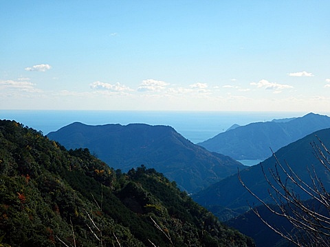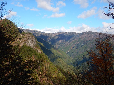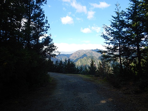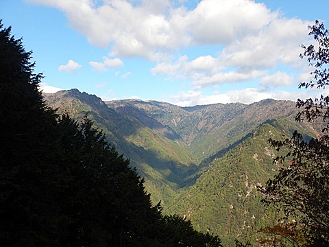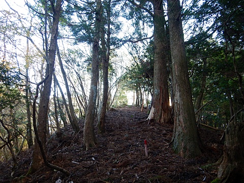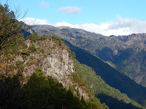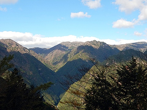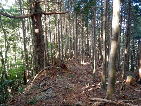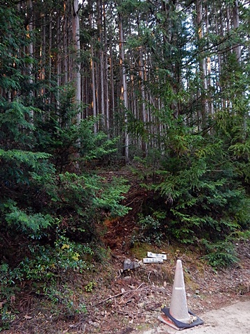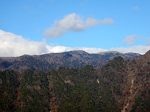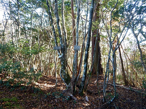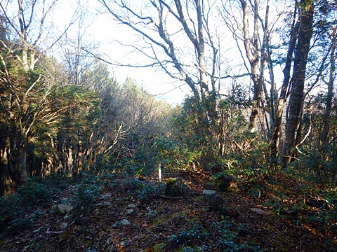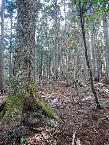 ■又口川沿いの県道から栃山木組林道に入り、水無峠まで車で上がる。途中に分岐もあったが、舗装路を道なりに進んで水無峠に達した。水無峠まで舗装されているが、さらに奥へ未舗装路が続いている。■水無峠から木津道という古道が分岐していて、「水無峠口」「木津道 ジブツキ口(~1.4km)」「木津道 中須口(林道1.4km先)」と書かれた標識があった。近くには小さなベンチも設置されていた。■水無峠の路肩に車を停めて、「橡山登山口」と書かれた標識が地面に置いてある所から入山した。■植林の中に山道が付けられているので、それに従って登っていく。■少し登ると、岩場が現れるが、尾根の右側を巻きながら進んだ。■尾根の左側に動物除けのネット状の柵が設置されている箇所もあり、これに沿って植林の中を登っていった。■橡山頂上が近づくと、尾根が分かれてやや地形が複雑になるが、南側に伸びる尾根を登っていくと、橡山頂上に到着した。■橡山頂上は樹林の中で、眺望は得られなかった。古い標識と三角点があった。■橡山頂上から登ってきた尾根と反対方向の南の尾根の方に道があるように見えたが、クチスボダムの近くまで続いているのかもしれない。■橡山頂上で休んだ後、元来た道を少し戻って、西に続く尾根に入った。最初は二重山稜のような地形になっている。■尾根上には山道があり、林業で使われたと思われるワイヤーも見られた。■小ピークをいくつか越えながら進んでいく。途中で八幡トンネルの奥の県境の稜線を望める箇所もあった。■橡山から35分くらいで標高970m地点を通過した。■さらに10分ほど尾根をたどると、国土地理院地形図に記載されている古和谷からの道との合流点に着いた。古和谷からの道はよく分からなかったが、ここから尾根を外れて標高1036m地点を巻く道に入る。■尾根から外れて少し行くと、沢を横切った。下の方に林道が見え、沢沿いに下ることもできそうだが、国土地理院地形図に記載されている道に沿って進むことにする。■道は不明瞭で、それらしい所を進んでいくが、結局、崩れて通過が困難な箇所が現れたので、無理をせず戻り、先ほどの沢沿いに下ることにした。■沢沿いに下っていくと、容易に林道に下り立つことができた。標高1036m地点を巻く道に入ってから25分くらいだった。■降り立った場所は、水無峠から地蔵峠方面に伸びている林道上で、そこから林道を通って水無峠まで戻った。■5分ほど林道を行くと、「地蔵下口」「木津道 清五郎滝4ノ滝・中須口」と書かれた標識があり、清五郎滝四ノ滝への道が分岐した。水無峠から林道と木津道は重複しているものと思われた。■さらに5分くらい行くと、閉ざされたゲートを通過した。看板に「木組林業専用道」や「一般車両進入禁止 三重森林管理署 尾鷲森林事務所」と書いてあった。ゲートの前は少し広くなっていて、四輪駆動車であれば、水無峠からここまで入ることができそうである。■ゲートの少し先には「清五郎滝 ⇒」と書かれた道標があり、清五郎滝二ノ滝と三ノ滝への道が分岐するが、あまり歩かれていないように見受けられた。■ゲートから数分進むと、「携帯電話可能エリア」と書かれた看板を見る。■ゲートから20分くらい歩くと、「中須口」と書かれた標識があった。■林道は全般的に北側の眺望が非常に良く、マブシ嶺や大台ケ原の方まで望むことができた。■ゲートから林道を40分くらい歩いて水無峠に戻った。■木津道は、尾鷲道から分かれて木津を経て相賀に続く古道のようである。■軽い山歩きのつもりで来たが、思っていたよりも歩き応えがあって良かった。■いずれ地蔵峠や木組峠を経て、マブシ嶺まで歩いてみたいと思った。(2025年6月23日記載 2026年1月5日更新)
