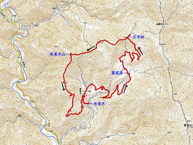 有東木745 →歩→ 葵高原850 →歩→ 正木峠930-935 →歩→ 有東木山1040-1105 →歩→ 有東木1240