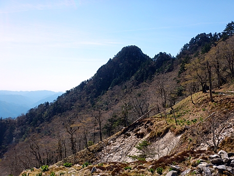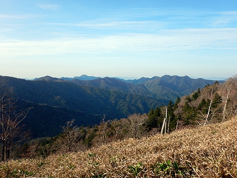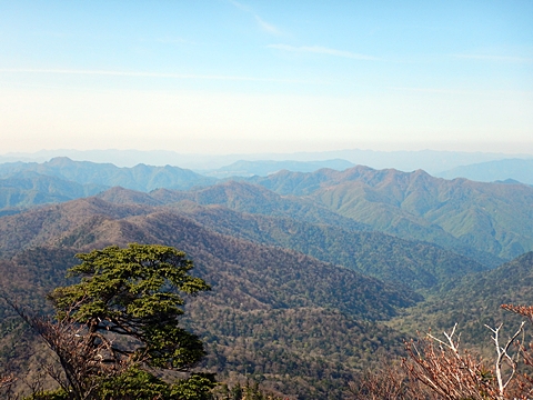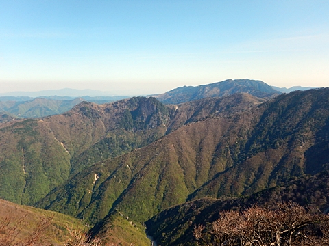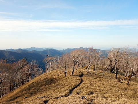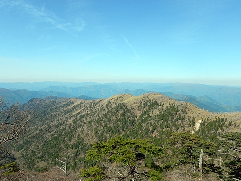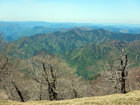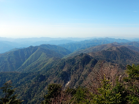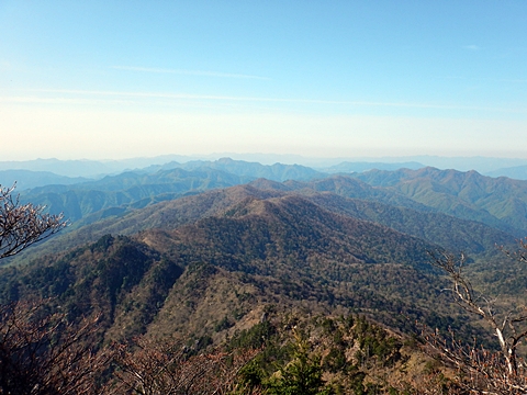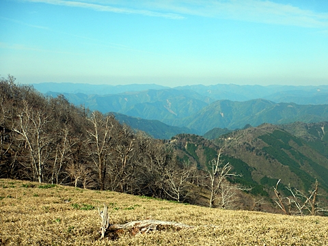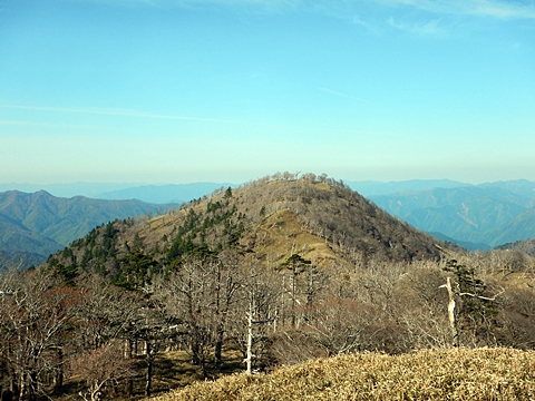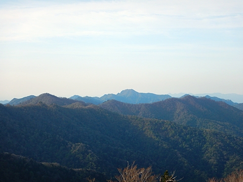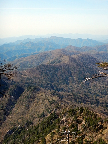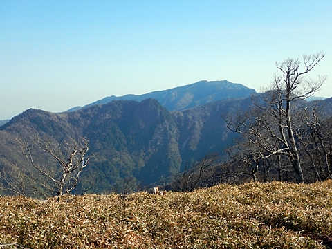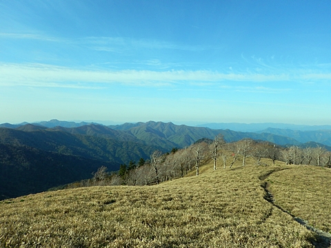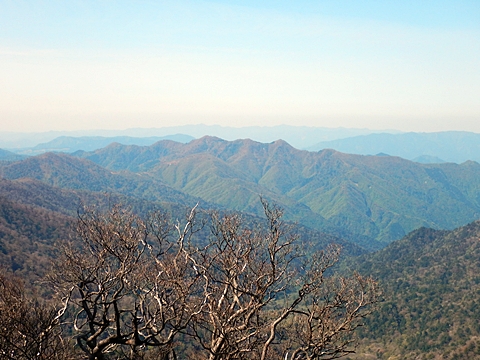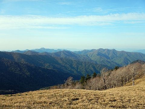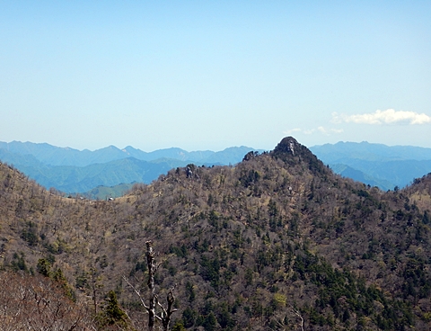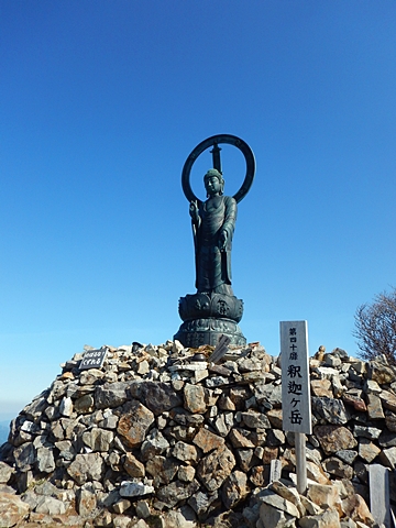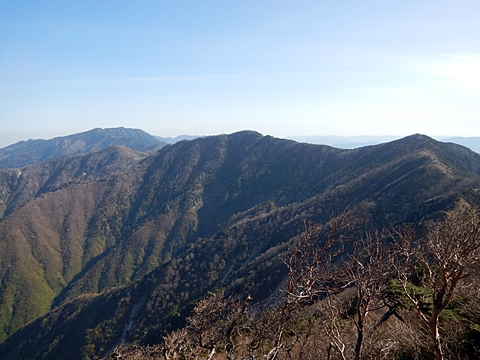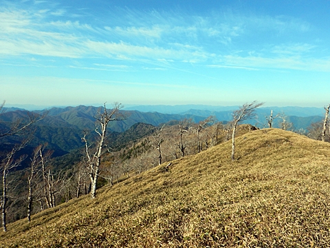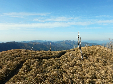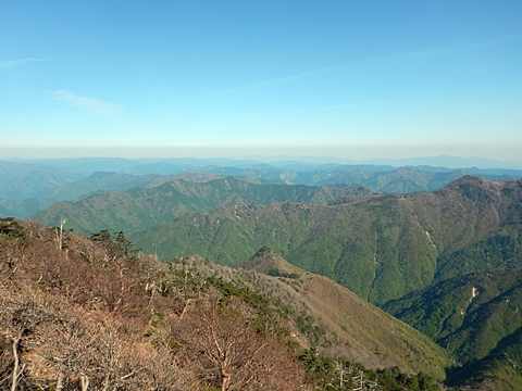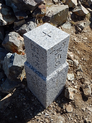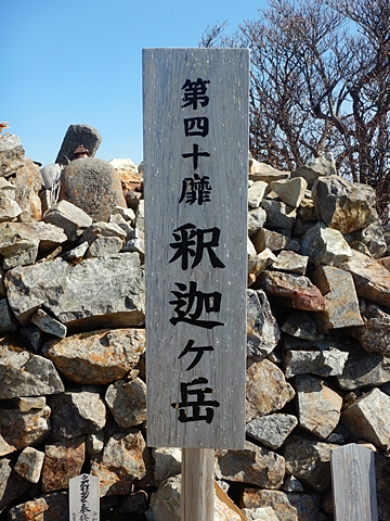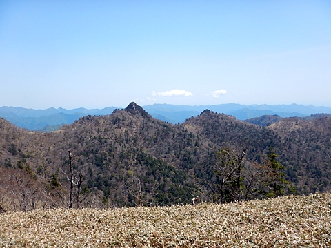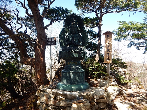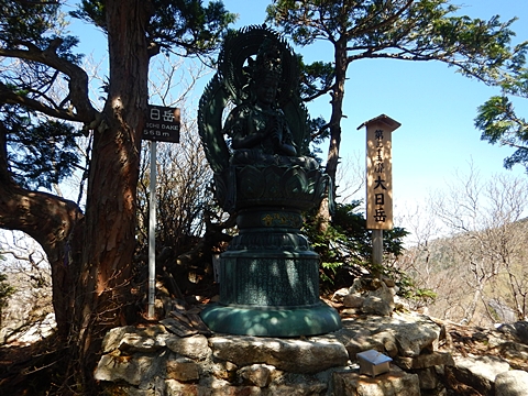 ■連休は大峰山脈の山に登りたくなったが、少し間が空いたため体力に自信がなく、比較的楽に登れそうな釈迦ケ岳を目指すことにした。■国道から車で旭ダムや奥吉野発電所を経て、林道旭線と林道不動木屋線を通り太尾登山口へ向かった。道は基本的に舗装されているものの、国道からとにかく遠く感じた。■太尾登山口には消防車両が数台停まっており、遭難事故があったのか物々しい雰囲気だったが、詳細は不明だった。■太尾登山口には公衆便所もあり整備されているが、すでに多数の車が停まっていたため、少し下の路肩に駐車した。■太尾登山口から入山し、しばらく樹林帯の中を登っていく。やや岩場のようになっている箇所もあり、短いハシゴが設置されている部分もあった。■太尾登山口から20分ほどで標高1434m地点を通過した。■その後は疎林の尾根歩きとなり、標高1434m地点から20分ほどで標高1465m地点を通過した。太尾登山口の2kmほど手前に「釈迦ケ岳登山口」と書かれた標柱と「この先、危険 通行止め」と書かれた貼紙があったが、その旧登山口からの道が左から合流した。太尾登山口方面には「← 十津川村 旭」「← 太尾登山口」、旧登山口方面には「旭・不動木屋谷林道 →」と書かれた道標があった。旧登山道は途中に山抜けがあるらしく、廃道になっているようである。■標高1465m地点を過ぎると、眺望の良い草原状の尾根歩きとなる。中八人山や笠捨山方面へ続く大峰南部の稜線、奥高野などの眺めがすばらしい。■やがて行く手に釈迦ケ岳が姿を現し、標高1465m地点から35分ほどで標高1618m地点を通過した。標高1618m地点は吉田ノ森といい、標識があった。■引き続き眺望はすばらしく、釈迦ケ岳や八経ケ岳、大日岳などを望みながらアップダウンのある尾根を進む。■千丈平には小さな池があった。「千丈平 1660m」と書かれた標識を過ぎると「← 釈迦ガ岳」「十津川村 旭 →」と書かれた道標があり、その間から右に深仙宿への道が分岐していた。■分岐から樹林帯に入り10分ほど登ると、大峰奥駈道に合流した。「<大峰奥駈道」「<深仙宿」「太尾登山口>」と書かれた道標があった。■分岐には「釈迦ケ岳山頂 0.3km 5分」「深仙ノ宿 1.3km 30分」と書かれた道標もあったが、実際には分岐から10分ほどで釈迦ケ岳頂上に到着した。■釈迦ケ岳頂上には、釈迦如来像や標識、三角点があった。眺望はすばらしく、孔雀岳や仏生ケ岳を経て八経ケ岳に続く稜線、七面山、中八人山、天狗山や地蔵岳を経て笠捨山方面に続く稜線、遠くは金剛山まで望むことができた。ほとんど追い越されなかったが、すでに多くの登山者が先着していた。■釈迦ケ岳頂上にも消防隊員が数名おり、時折無線で交信していたが、何があったのかは分からなかった。■しばらく眺望を楽しんだ後、分岐まで戻って深仙宿方面へ進んだ。■大峰奥駈道に入ると急に道が悪くなり、笹薮の中を下っていく。逆コースの場合は大変そうに思えた。■分岐から25分ほどで左手に岩壁が現れた。第三十九靡の都津門である。岩壁には小さな岩穴があり、この穴をくぐると極楽に行けると言われているらしい。先着の登山者が岩穴から戻ってきたところだったが、危険と思われ、眺めるだけにした。■都津門から10分ほど下ると、深仙宿に到着した。■深仙宿には、灌頂堂という祠と避難小屋がある。近くの四天岩のそばには行者髭塚の碑や香粧水という水場がある。■深仙宿から大日岳は遠そうに見えたが、せっかくなので往復することにした。■深仙宿から右手に聖天ノ森を見ながら登っていく。■途中に「太古の辻・前鬼 →」「← 大日岳(行場)」と書かれた道標があり、左に大日岳への道が分岐する。大日岳方面には「この先、修験道の行場です。岩場・鎖場、道中は大変危険です! 修行以外の方はお入りになることをお勧めしません。修行される方は、一切自己責任にてご修行下さい。大峯行者」と書かれていたが、そのまま大日岳へ向かった。■正面に大日岳が現れ「行場 通行禁止」「修験者の行場です 一般登山者は 迂回路を利用してください 下北山村」と書かれた看板があった。よく見ると右側に「大日岳迂回路」と書かれた道標があり、これに従って迂回路を登った。■ロープの付いた岩場を登り切ると、大日岳頂上に到着した。迂回路は細くてすれ違いは困難だが、慎重に登れば問題ない。■大日岳頂上には標識と大日如来像があり、片隅から釈迦ケ岳や深仙宿を望むことができた。■後から何人か登ってきたが、頂上は狭いため、早々に辞して深仙宿へ戻った。■深仙宿で少し休んだ後、釈迦ケ岳を巻く道に入り、千丈平へ出た。巻道とはいえ登り主体であり、疲れた体にはやや堪えた。■千丈平から元来た道を戻り、太尾登山口へ下山した。後方から消防隊員の集団がやってきたが、速めのペースを維持して太尾登山口に先着した。■太尾登山口にはまだ消防車両がいたが、問題は解決したのか片付けをしているところだった