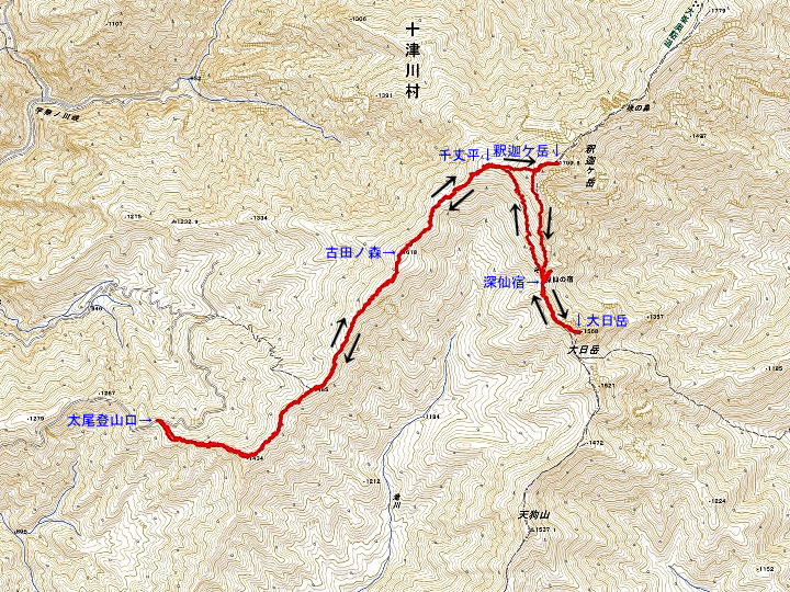 太尾登山口605 →歩→ 古田ノ森720 →歩→ 千丈平740 →歩→ 釈迦ケ岳800-820 →歩→ 深仙宿910-920→歩→ 大日岳945-955 →歩→ 深仙宿1020-1030 →歩→ 千丈平1105 →歩→ 古田ノ森1140→歩→ 太尾登山口1235
